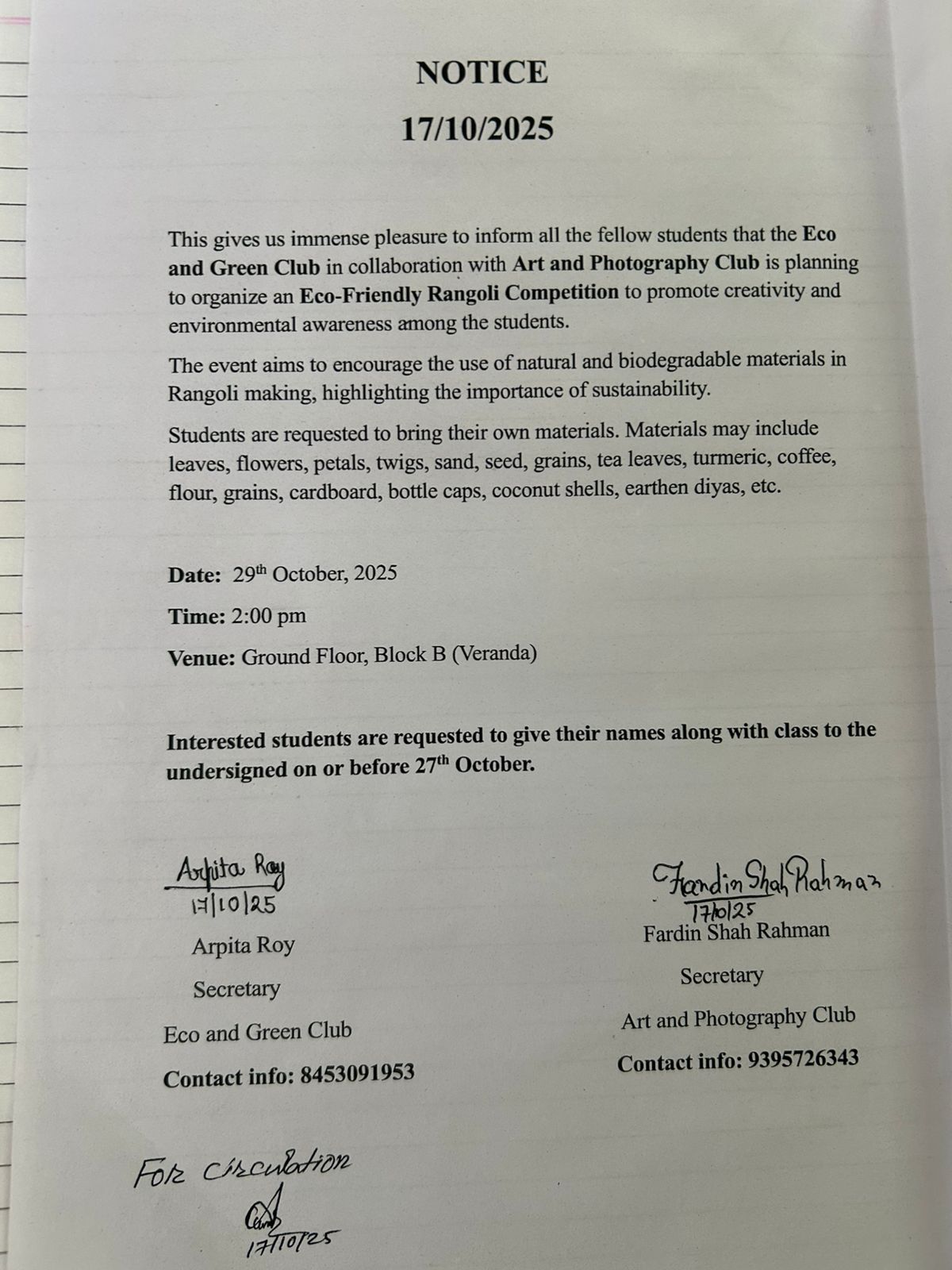 | Eco-Friendly Rangoli Competition | To promote creativity and awareness in the campus, an eco friendly rangoli competition has been organised in the campus | 2025-10-28 | View File |