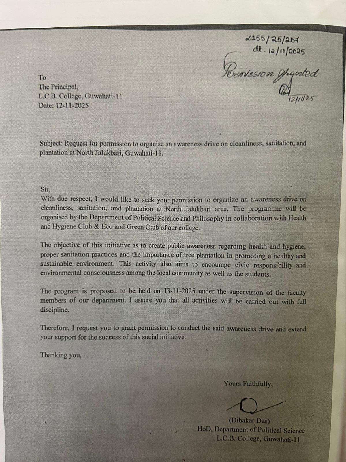 | Awareness Drive on cleanliness, sanitation and plantation at North Jalukbari | Eco and Green Club in association with Department of Political Science, Philosophy and Health and Hygience club had organised an Awareness drive at North Jalukbari | 2025-11-13 | View File |